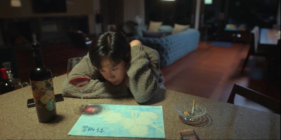 8화 재준은 예솔이의 하얀 벚꽃 그림을 앞에 두고 홀로 와인을 마십니다.